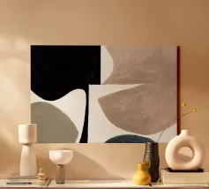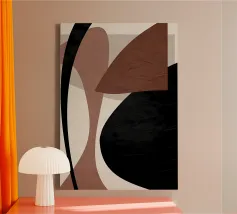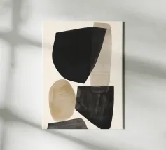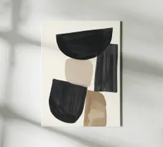 An abstract composition of layered organic shapes in black, beige, and warm brown, arranged vertically to create a rhythmic visual dialogue. The soft brushwork and translucent layering convey a quiet sense of structure, movement, and balance within minimal form.
