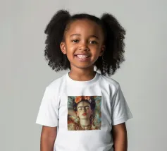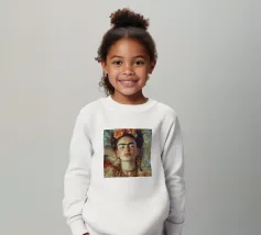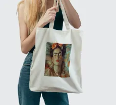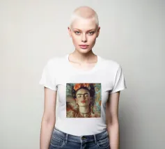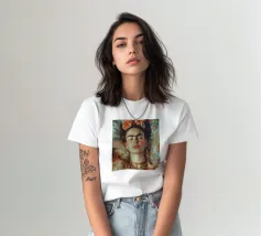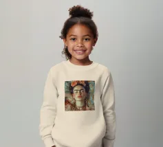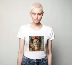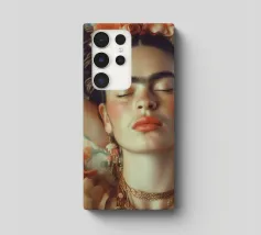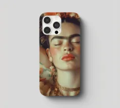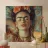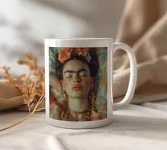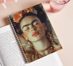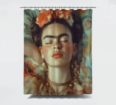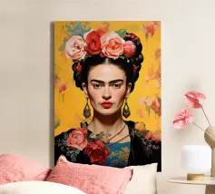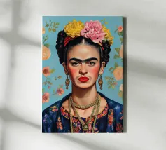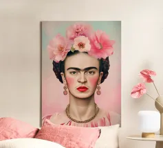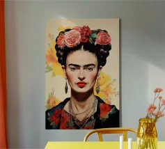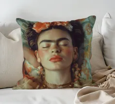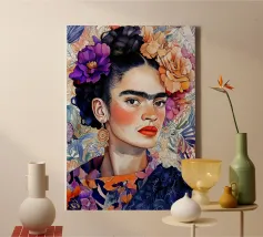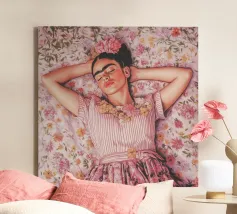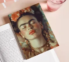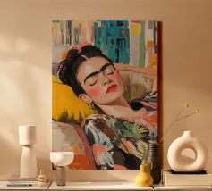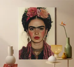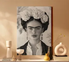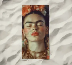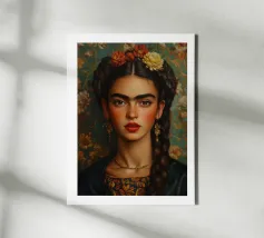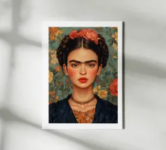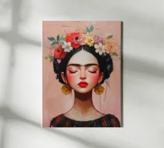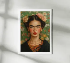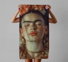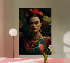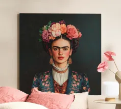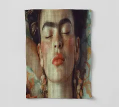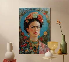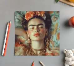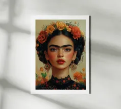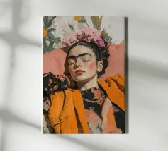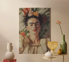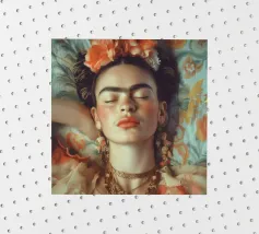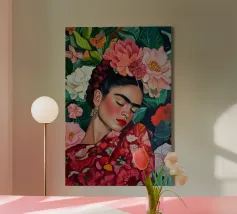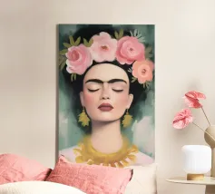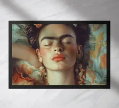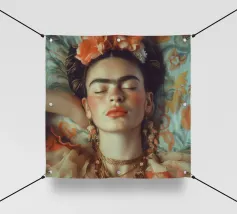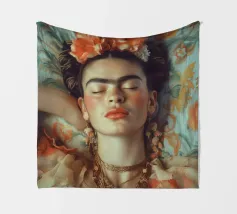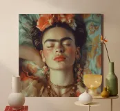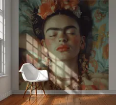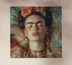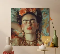 This boho-style portrait photograph inspired by Frida Kahlo shows the artist lying down with her eyes closed, framed by a magnificent flower crown in earthy beige and orange tones with a hint of turquoise. The floral elements give the artwork a botanical touch and emphasise her characteristic features, making it a unique digital eye-catcher for any interior.