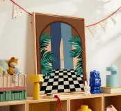 An illustration of an arched gateway with a checkered floor, opening up to a view of a lush tropical paradise with palm trees. The scene is an inviting and mysterious glimpse into a beautiful escape.