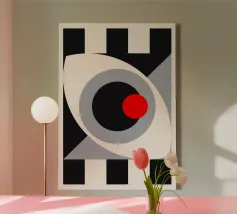 A geometric composition features a large circle intersected by vertical lines, topped with a bold red circle. The monochrome elements contrast against a dark, swirling background.
