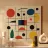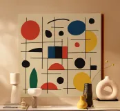 A collection of colorful shapes, specifically circles and lines, create a dynamic composition. The use of primary colors adds a vibrant and modern feel.