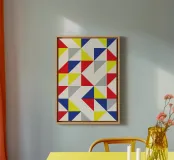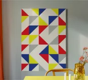 A dynamic and engaging geometric pattern digital poster inspired by the Bauhaus and De Stijl movements. The design features a continuous, tiled arrangement of squares, each divided into two triangles. The pattern uses a classic palette of primary colors—red, blue, and yellow—along with grey and off-white, creating a vibrant, rhythmic, and visually complex composition. This premium digital download boasts 7000x5000 pixels at 300 dpi, ensuring exceptional clarity and superior print quality for large format art.