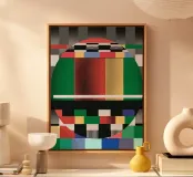 A composition of geometric patterns features a circle with bold vertical stripes in red, yellow, and green, intersected by horizontal bars and surrounded by a variety of checkered and solid colored rectangles. A mix of bright and muted colors, along with sharp lines