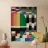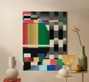 A vibrant assortment of geometric shapes and bold colors comes together, creating a dynamic composition reminiscent of television test patterns. The interplay of squares, rectangles, and circles in various hues creates a visually striking contrast.