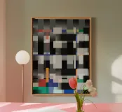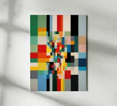 A geometric arrangement of colored rectangles and squares creates a vibrant abstract pattern. The design utilizes a grayscale background with pops of orange, blue, and green, creating a visually dynamic composition.