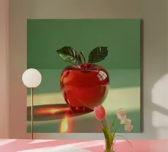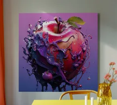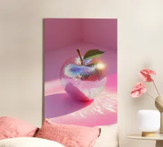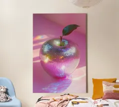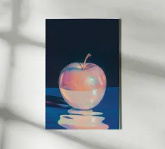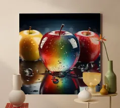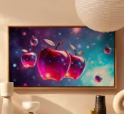 Glossy apples with a vibrant cosmic design float against a colorful background filled with sparkling lights.