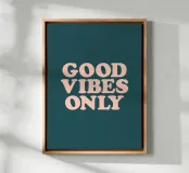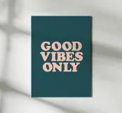 Infuse your space with positivity using this retro-inspired typography art print. The uplifting phrase "Good Vibes Only" pops in soft peach retro lettering against a rich, deep petrol green background. This eye-catching piece combines vintage charm with a modern mantra, perfect for adding a touch of optimism to any room. From living areas to home offices, this artwork brightens the mood and promotes a positive atmosphere. Let this stylish print serve as a daily reminder to embrace good energy and maintain an upbeat outlook on life.