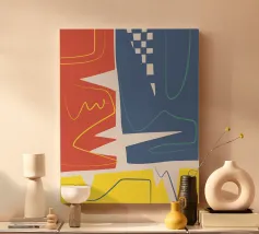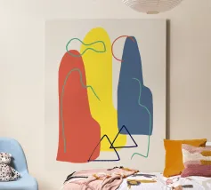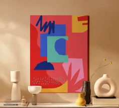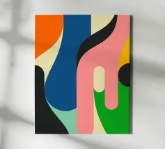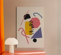 Bold geometric shapes in blue, yellow, and pink contrast against a neutral background. Organic shadows and colorful dots provide a dynamic and abstract composition.