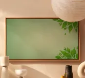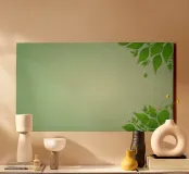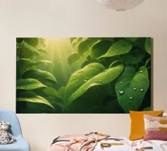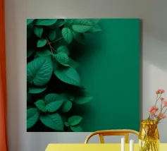 An abstract design features lush green leaves adorning the corners of a gentle background, providing a refreshing and tranquil atmosphere perfect for various digital uses.