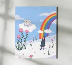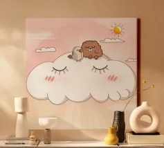 This artwork depicts a grumpy-looking cloud with a thought bubble containing a bird and a bear. The humorous and imaginative scene is set against a soft blue background.