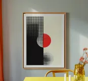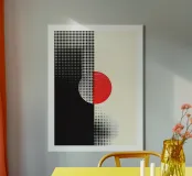 Cette illustration moderne joue avec les contrastes et la simplicité des formes géométriques. Un grand cercle rouge, bien défini, est placé contre un fond noir et crème, tandis que des motifs de demi-tons en dégradé ajoutent une texture subtile, créant une dynamique visuelle saisissante. Ce design épuré et audacieux est parfait pour une décoration minimaliste et contemporaine.
