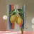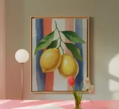A delicate hand-painted artwork featuring two fresh yellow lemons with green leaves set against a soft striped background in calming shades of red, blue, and light tones. This citrus wall art blends freshness with elegance, making it ideal for kitchens, dining rooms, or cafés that want a vibrant yet soothing decorative piece.