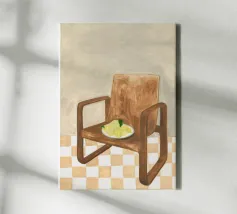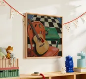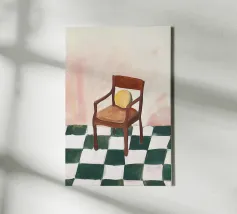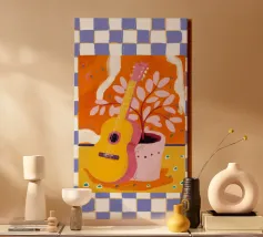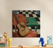 An acoustic guitar rests on a red chair beside a checkered floor, inviting stories in sound and solitude.