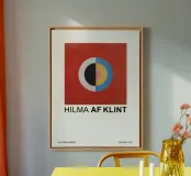 This striking art print features Hilma af Klint's abstract work from "The Swan Series," likely from 1915. The central motif is a powerful circle divided into segments of black, white, blue, and yellow, with a subtle pink inner core, all set against a vibrant red background. This piece embodies themes of dualism, balance, and interconnectedness, characteristic of Klint's pioneering abstract art. The minimalist design and profound symbolism make it a captivating piece. This high-quality digital poster (7000x5000 pixels, 300 dpi) beautifully captures the ethereal beauty and groundbreaking artistr