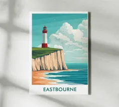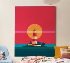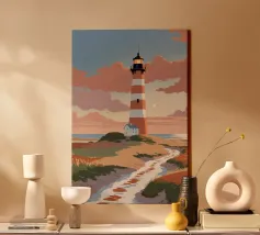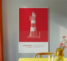 This artistic rendering of the Hörnum Lighthouse plays with dramatic shadows and abstract patterns to create a compelling sense of depth. The contrast between its bold red-and-white stripes and the muted, modernist background adds to its visual appeal. The composition enhances the lighthouse’s architectural grandeur, while the stylized approach gives it a contemporary twist, making it a captivating addition to maritime-inspired artwork collections.