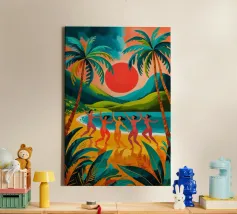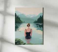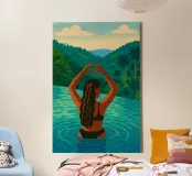 Bring serene tropical vibes into your space with this vibrant art print featuring a woman standing in an infinity pool, hands forming a heart against a lush jungle backdrop. Inspired by gouache and acrylic styles, this illustration blends nature and feminine elegance in warm, earthy tones. Perfect for modern interiors, wellness spaces, or as a thoughtful gift for travel and self-love enthusiasts.