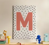The playful design with the letter "M" in bright red on a black dot pattern is a stylish eye-catcher. Perfect for children's rooms, modern living spaces or as a gift idea with a personal touch. The clear typography combined with a Scandinavian-inspired pattern adds a charming accent to any room. Ideal for combining with other letters from the series.