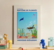 Dive into the deep blue with this captivating scuba diving poster! This colorful illustration features a diver exploring a vibrant coral reef, surrounded by tropical fish, a majestic manta ray, and a jellyfish. It's the perfect ocean souvenir for sea lovers and diving enthusiasts. This retro print brings the beauty of the underwater world to your home. A fantastic travel lover gift that adds unique coastal decor and a splash of adventure to any room! Scuba diving print, Coral reef art, Ocean souvenir, Underwater illustration, Marine life poster, Tropical decor, Retro diving, Manta ray art
