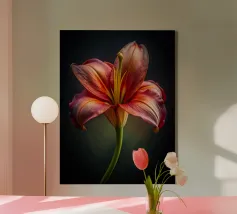 A stunning bearded iris in full bloom, captured in a close-up view against a dark background. The intricate details of the flower's ruffled petals, vibrant colors, and contrasting textures are beautifully highlighted. This exquisite artwork celebrates the beauty and elegance of nature's creations.