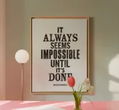 Elevate your space with this powerful typography art print. Featuring the timeless wisdom "It Always Seems Impossible Until It's Done" in black distressed letterpress lettering on a soft grey background, this piece exudes vintage charm and encouragement. Perfect for offices, study areas, or any space needing a boost of motivation. The high-quality print showcases the intricate texture of letterpress, creating a tactile visual experience. Embrace perseverance and determination with this stylish artwork that serves as a daily reminder to push through challenges and achieve your goals.