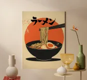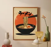 A stylish fusion of Japanese aesthetics and modern graphics: A steaming bowl of ramen is presented in front of a bright orange-red sun disc. The minimalist composition with clear lines and reduced areas of colour combines traditional Japanese calligraphy with the style of vintage travel posters from the 1950s. The textured surface lends the work an authentic warmth. An eye-catching art print that celebrates culinary passion and enriches any room, especially the kitchen, with Far Eastern flair and timeless elegance.