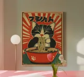 This deliciously funny retro poster in Japanese style shows a black and white cat slurping ramen noodles with relish from a bright red bowl. Against a dynamic sunburst background in red and cream, the contented gourmet presents itself with half-closed eyes and paws on the edge of the bowl. The Japanese characters at the top of the picture and the paw prints on the bowl round off the authentic look. A charming wall mural not just for cat lovers and Asian food enthusiasts. Perfect for the kitchen and dining room, spiced up with a pinch of humour.