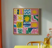 A joyful and colorful grid is filled with a variety of playful patterns and icons, including stylized flowers and abstract shapes, creating a cheerful and decorative design.