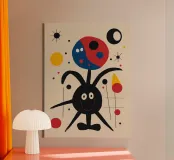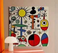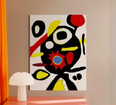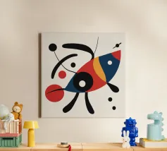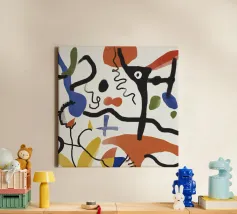 A whimsical and abstract depiction features a cheerful creature with a round body and multiple limbs, surrounded by colorful geometric shapes and playful lines. The vibrant primary colors create a lively and dynamic composition on a neutral background.