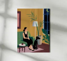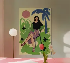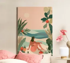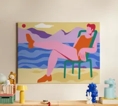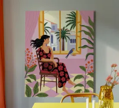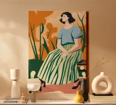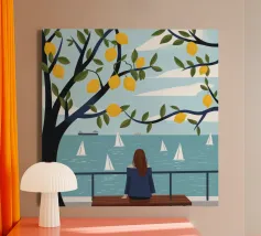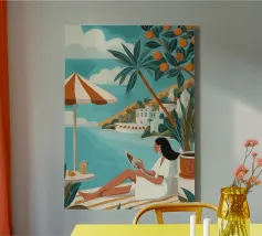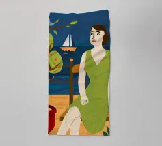 A woman in a lime green dress sits gracefully by the sea, with sailboats on the water and birds in the sky, capturing a moment of serene coastal living.