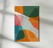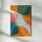 An abstract artwork features multiple layers of color and texture, with torn paper effects and dotted patterns in a palette of green, terracotta, and orange, creating depth and tactile interest.
