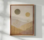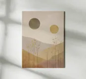 Boho wall art featuring layered shapes in a landscape in rust, ochre and beige – perfect for Scandinavian, retro or eclectic interiors.