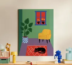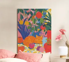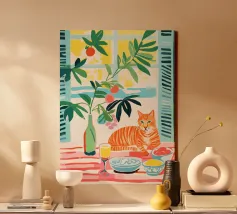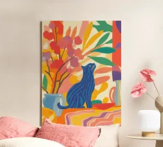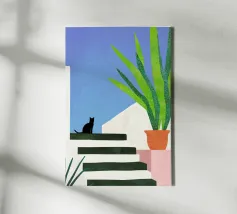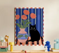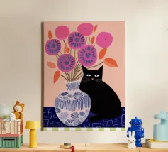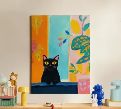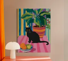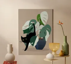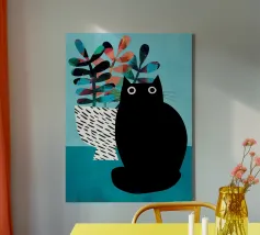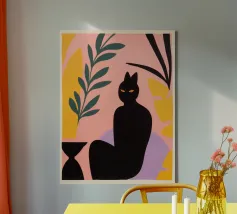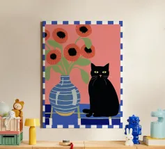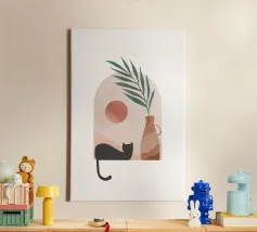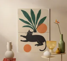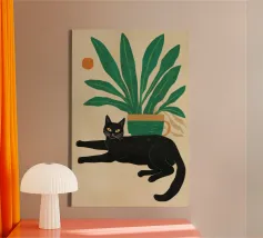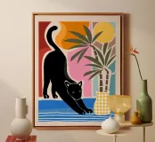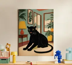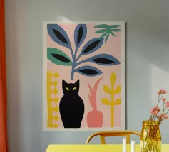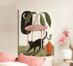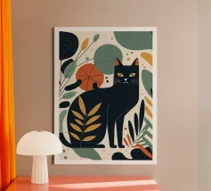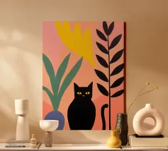 black cat art, tropical cat print, abstract jungle poster, modern animal wall art, colorful nature illustration, bold feline decor, minimalist wildlife art, tropical leaves artwork, vibrant sun poster, boho jungle decor, geometric vase art, contemporary cat design, exotic animal print, abstract tropical scene, artistic cat poster, stylish home wall decor, jungle animal silhouette, colorful modern print, palm tree artwork, sunset jungle art