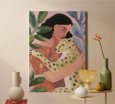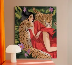 This artwork captures a person in a black dress striking a poised pose beside a leopard. The scene exudes sophistication, confidence, and timeless artistry.