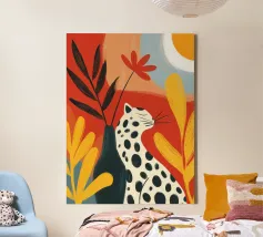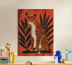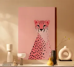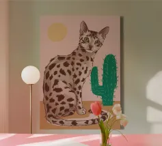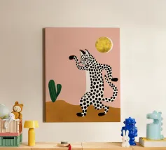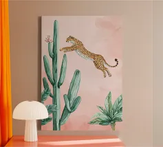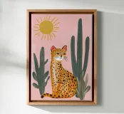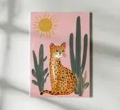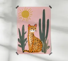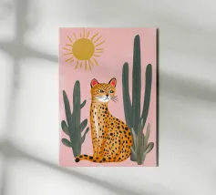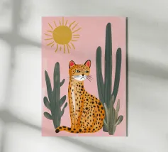 This charming and whimsical illustration features a stylized leopard with a confident expression, sitting among tall green cacti in a sunny desert scene. The background is a soft, textured pink, with a simple, radiating sun in the corner. The artwork has a playful, folk-art feel with its bold colors and naive style, creating a captivating and fun piece. Created at a high-resolution of 7000x5000 pixels (300 dpi), this digital print ensures excellent detail and a beautiful, painterly finish, perfect for adding a touch of personality and bohemian flair to any space.