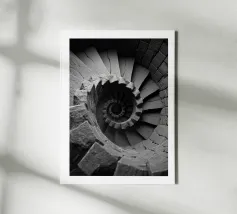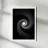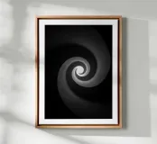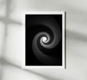 A black and white poster depicting a sculpted spiral leading the eye towards a luminous heart. Mineral texture, soft gradations and deep contrast create an illusion of hypnotic movement, both zen and graphic. This minimalist wall poster adds depth, mystery and modernity to the living room, bedroom or office, and complements contemporary, Scandinavian, industrial or Japandi interiors.