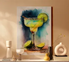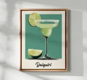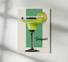 A vibrant lime-green daiquiri served in a classic coupe glass with a frosted sugar rim, framed by fresh lime wedges against a soft teal background. The bold colors and clean illustration style create a refreshing, tropical accent for any kitchen or home bar.