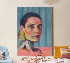 A haunting portrait emerges in bold strokes of pink, yellow and charcoal against a cobalt field. Soft, impressionistic textures blend around large, contemplative eyes that seem to hold inner light and shadow in equal measure. The contrasting palette and fluid brushwork evoke fleeting emotions and introspective wonders, inviting viewers to linger on every nuance of form and color. Printed in archival quality, this piece bridges expressive abstraction and portrait realism, making a striking centerpiece for living rooms, studios or gallery walls craving both depth and vibrancy.