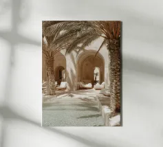 Step into the heart of Marrakech with this captivating photograph of a lush, green riad interior. The vibrant greenery and intricate architectural details create a serene oasis of tranquility, where traditional Moroccan design meets natural beauty. Rich plants cascade around the courtyard pool, their vibrant leaves contrasting with the elegant tiled floors. This image evokes the calm and allure of a Moroccan haven, where the hustle of the city fades away and you're enveloped in a peaceful, verdant escape.