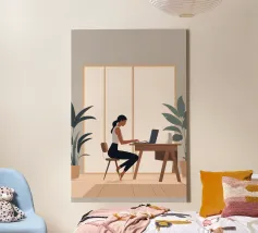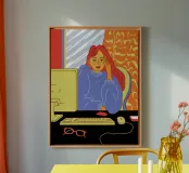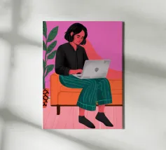 A contemporary illustration of a woman with vibrant red hair working at her computer in a dimly lit room. The glow from the screen illuminates her face and blue shirt. The scene captures a moment of focus and late night productivity, with personal items like glasses on the desk.