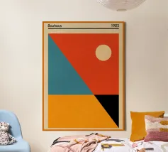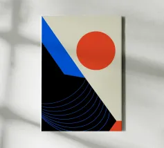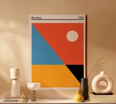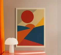 An elegant, minimalist abstract poster utilizing bold color blocking and simple geometric shapes to evoke a sunset landscape. The composition features a large, dominant orange/yellow triangle suggesting a mountain or distant horizon, set against a light background. Below, a contrasting black shape grounds the image, while a small, vibrant burnt orange circle serves as a sun. The design is a beautiful display of balance, form, and striking color contrast, highly inspired by the Bauhaus and De Stijl movements. This high-quality digital download (7000x5000 pixels, 300 dpi) ensures a sharp, modern