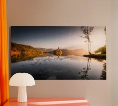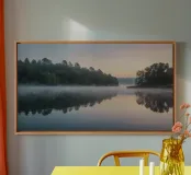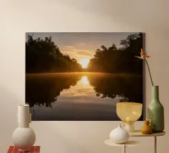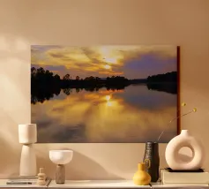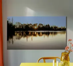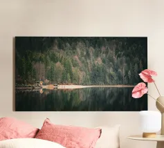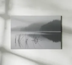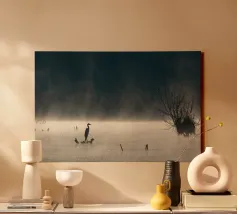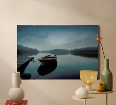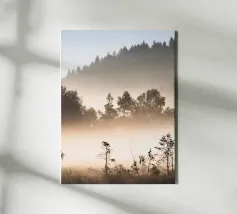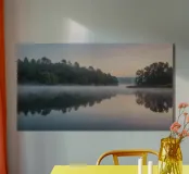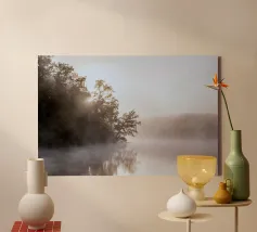 mist rises over a tranquil lake surrounded by lush trees canvas