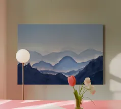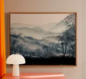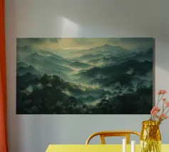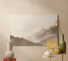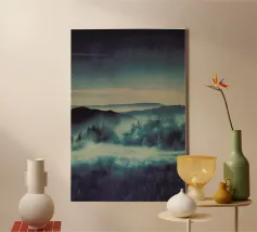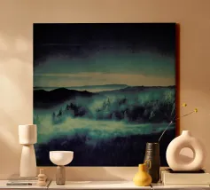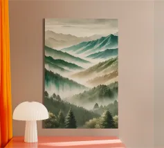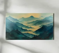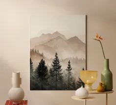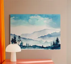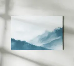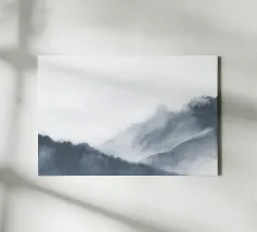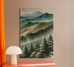 A misty, tonal landscape of silhouetted trees and softened mountain layers, this expressive watercolor evokes quiet mornings, distant ridgelines, and the hush of untouched wilderness. Perfect for modern interiors seeking stillness, depth, and natural mystery.