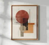 A bold abstract artwork featuring circles, rectangles, and fine lines in rust red, black, beige, and orange. The textured finish gives it a vintage touch, making it ideal for modern, boho, or mid-century interiors.