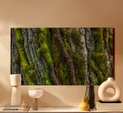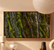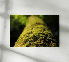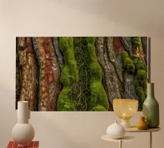 The bark of a large tree is adorned with vibrant green moss, intertwined with twisting branches, reflecting the tranquil ambiance of a forest in the early morning light.
