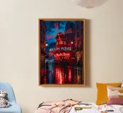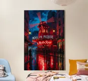 The iconic Moulin Rouge in Paris is illuminated against the deep blue night sky, its glowing red neon lights reflecting brilliantly on the wet cobblestone streets. Figures in dark coats stroll through the vibrant atmosphere, adding a mysterious yet lively touch. The spinning windmill blades radiate energy, casting warm light across the bustling neighborhood. This dynamic view captures the Moulin Rouge's timeless allure, celebrating its legacy as a Parisian symbol of nightlife and artistic expression.