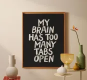 Bring humour to your space with this bold typography art print featuring the phrase "My Brain Has Too Many Tabs Open" in hand-painted white lettering on a striking black background. Perfect for those who embrace the chaos of multitasking, this minimalist design combines wit with modern aesthetics. Ideal for home offices, study rooms, or as a thoughtful gift for busy creatives, students, or professionals. Printed on premium-quality paper, this monochrome masterpiece adds a touch of personality and charm to any wall while sparking smiles and relatable conversations.