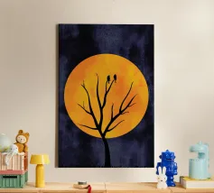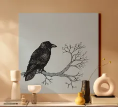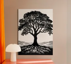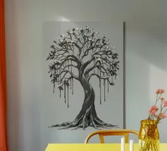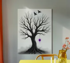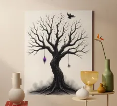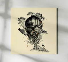 This silhouette illustration shows a weathered, gnarled tree with hanging threads of moss on which several ravens are perched. Two lanterns hang down from the branches, while bats fly in the background. The design conveys a mysterious, slightly gloomy atmosphere reminiscent of old legends or fantasy worlds. Ideal for fans of gothic style, fairytale aesthetics or Halloween decorations. The minimalist contrast between the black and light-coloured background enhances the dramatic effect.