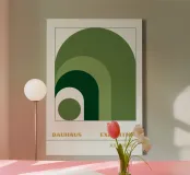 A beautiful abstract work rooted in the foundational design principles of the Bauhaus school. The composition features two main sets of nested arches and a minimal circle, all defined by clean lines and solid planes. This monochromatic piece showcases a striking gradient of Forest Green and Sage Green tones, blending the historical precision of geometry with the modern trend for biophilic and tranquil palettes. The layered arches create an illusion of depth and receding space, highly valued in early modernist design. The title "BAUHAUS EXHIBITION JULY 19 1923" anchors the print in the influent