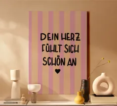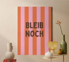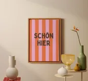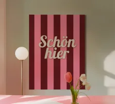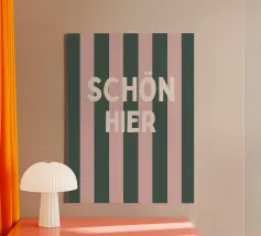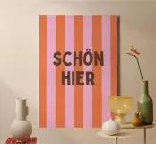 This modern typography poster with the statement "Schön hier" ("Nice here") creates a good mood and a positive feeling in the home. The bold colours and clear shapes make it a stylish highlight for the living room, hallway or home office.