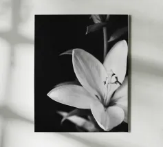 This captivating monochrome photograph masterfully plays with the interplay of light and shadow, revealing a dramatic bouquet of flowers. Some petals are bathed in brilliant light, highlighting their delicate textures and forms, while others recede into deep, velvety darkness, creating a stark and compelling contrast. The absence of color accentuates the intricate details and emotional depth of the composition, inviting viewers to explore the subtle nuances of light and the profound beauty found within the shadows. It's a timeless piece that evokes a sense of mystery, elegance, and the epheme